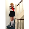 Blonde shoulder length hair.