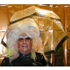 I dress totally in rubber dresses and undergarments and wear thigh high boots with 8 inch spike heels and 4 inch platforms. I wear very heavy gaudy makeup, wild colored big hair wigs and love white or light baby pink lipstick.
